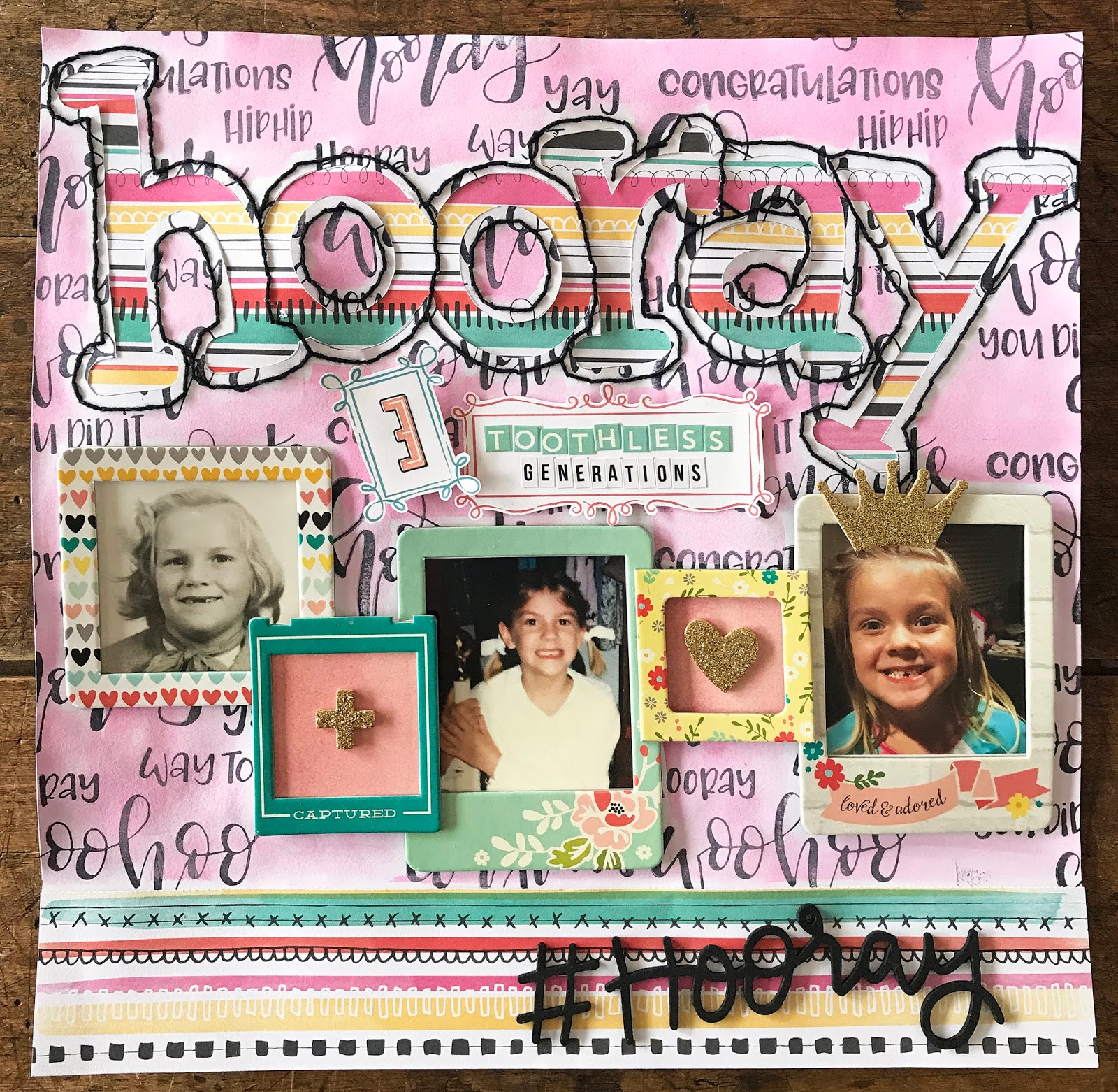 ReplyDeleteLeslie: genius layout design!!! The large lettering title balances parallel to the row of frames you put together for the 3 generations of tooth fairy photos!!! And even though it was a long series of processing you had to do to create the title, I think it is cleverly framed and perfect for this challenge! Very creative!