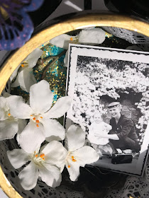 I began by removing the glass on the clock & coating the entire piece with black gesso. I worked on the background inside of the clock first by adding LuminArte Primary Elements artist pigments & chunky gold glitter, sealing it with final fixative spray. I glued lace to the sides & added a flowering branch to mimic the photo & add a touch of true yellow. I bent the petals of a Prima dimensional metal flower to hold my photo, securing it with raised foam adhesive dots.